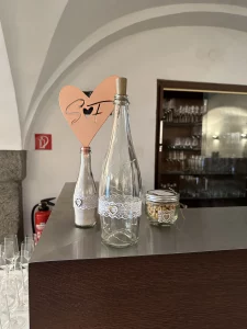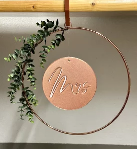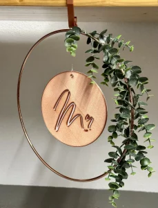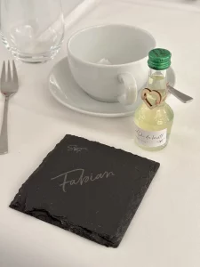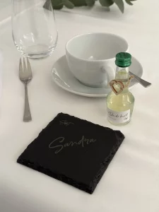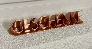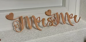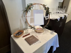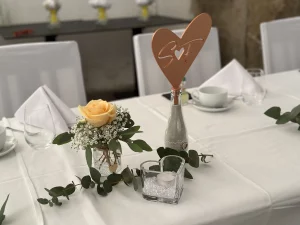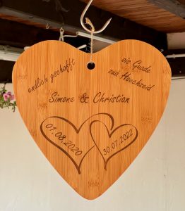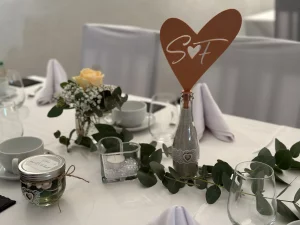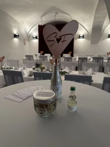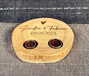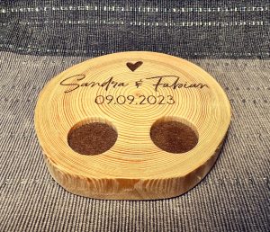 Mit Hilfe von 3D-Druck und Lasergravur konnte hier das gesamte Hochzeitsthema verwirklicht werden. Jedes Dekorationselement hat die gewünschte Schriftart, Farbe und passt exakt zum Stil. Auch Sonderlösungen, wie zum Beispiel die Halterung für den Ring mit der Sitzordnung, konnten verwirklicht werden. Individualität anstelle von Massenware, die bei jeder Hochzeitsfeier zu sehen ist.